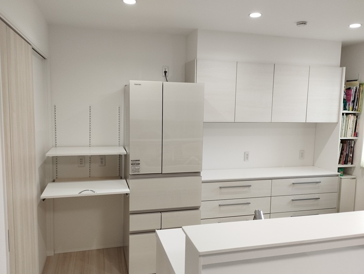 一条工務店のカップボードと冷蔵庫、そしてDIYの組み合わせでデッドスペースが無いスッキリした組み合わせになったと思います。