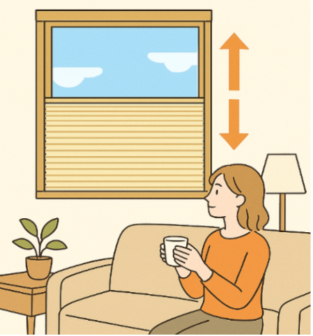 市販品では画像のようにハニカムシェードでも、上からも開けられるタイプがあります。これなら目隠しをしながら、採光と外の景色を見れます。